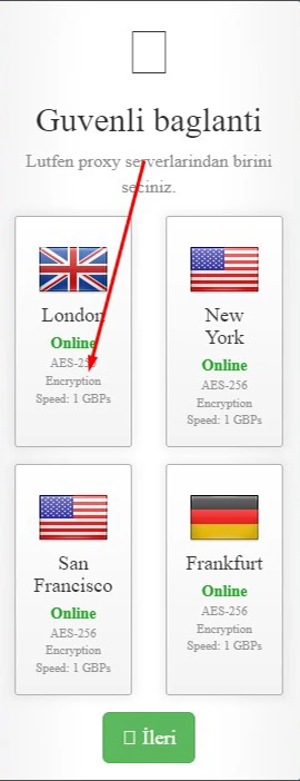 2- Burda Başkan Simülatörü Elmas Hilesi için 4 adet güvenli proxy oluşturulmuş. Bunlardan bir tanesini seçip ileri diyoruz.