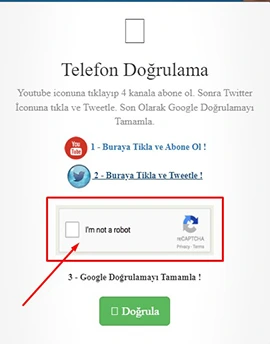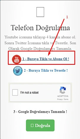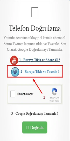 Youtube iconuna tıklayıp 4 kanala abone ol. Sonra Twitter İconuna tıkla ve Tweetle. Son Olarak Google Doğrulamayı Tamamla.